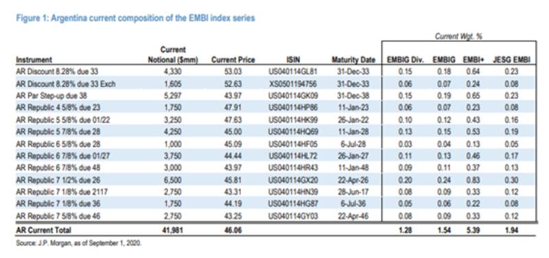 Previa a la reestructuración, el riesgo país estaba compuesto por 13 bonos de ley extranjera, arrancando por el DICY, Globales con vencimiento en 2022 y 2023. También aparecían bonos Pares con vencimiento a 2038 así como también Bonares a 2026, 2027, 2028, 2036 y 2046. Finalmente, dentro del índice estaba incluido también el bono centenario a 2117.