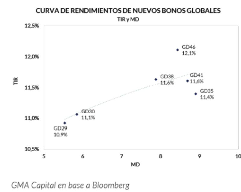Guma consideró que los bonos están en niveles razonables dadas las condiciones macro actuales.“Si bien el Gobierno pudo aplazar los pagos de deudapara como mínimo dentro de 5 años, por lo que no habría problemas de pago de deuda en el mediano plazo, los bonos reflejan la incertidumbre por la mala situación económica sumado a la escasa visibilidad a futuro en cuanto al rumbo que podrían tomar las políticas del Gobierno , comentó el research de CMA.