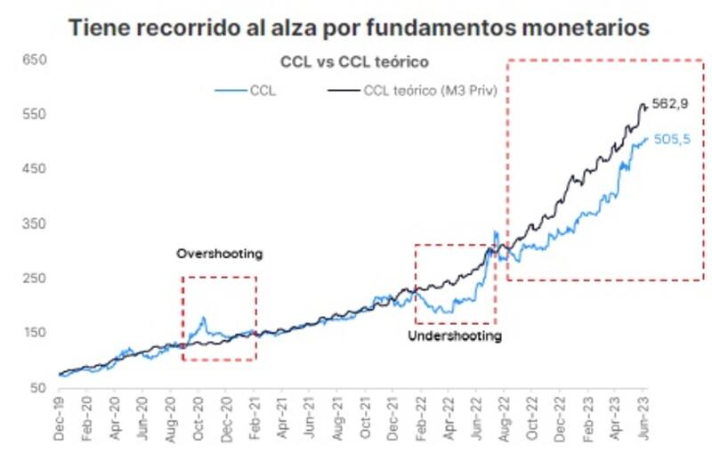 "El CCL teórico, que considera la evolución de la cantidad de dinero en la economía (M3 privado), se ubica en $ 563, lo que indica una brecha del 11,4% con observado. Este valor muestra la foto hasta hoy, pero no la película que está por venir. Habría muchos pesos en camino para financiar el déficit fiscal, así como por operaciones de mercado abierto, adelantos transitorios y un posible dólar soja 4. Así, el dólar CCL teórico se irá ajustando al alza", comentaron.