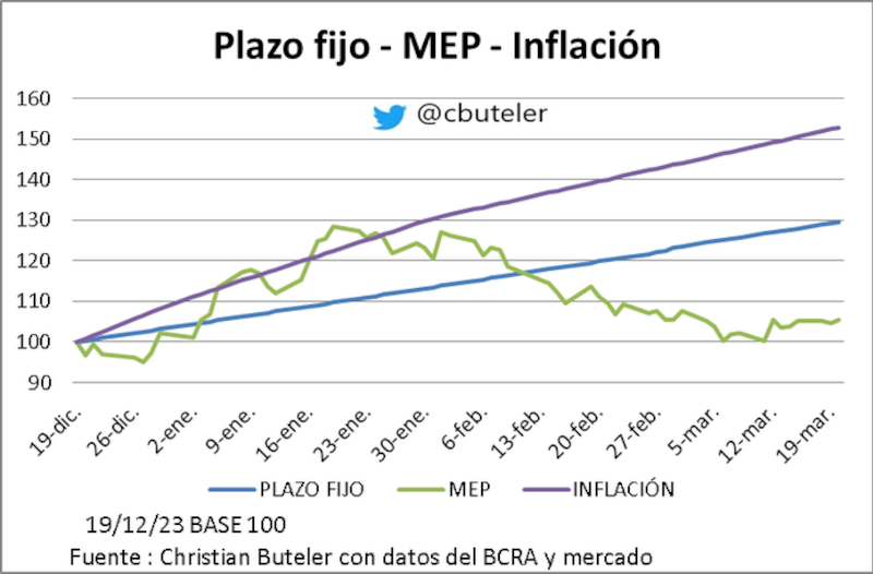 "Para que el MEP alcance al plazo fijo debería estar en $ 1266 y para alcanzar la inflación en $ 1495", detalló Buteler sobre los valores que tendría que tener la moneda norteamericana. Un par de cifras muy por arriba de los $ 1030 en los que fluctuó el dólar en esta semana de marzo.