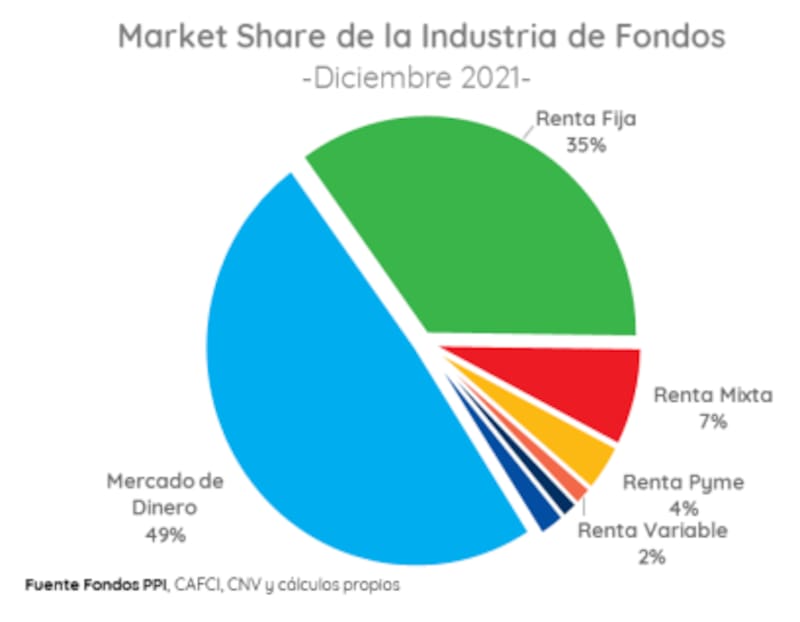 "En el análisis por categoría, la tendencia se mantuvo a lo largo de los meses (cerrando con una foto muy similar a la de fines de 2020). Los fondos de dinero representan la mitad del market share de la industria, seguido por los fondos de renta fija, que ya alcanzan el 35%. Los fondos de renta mixta se mantienen en torno al 7%, en tanto los fondos de renta variable sumaron un punto porcentual y representan el 3%", detallaron.