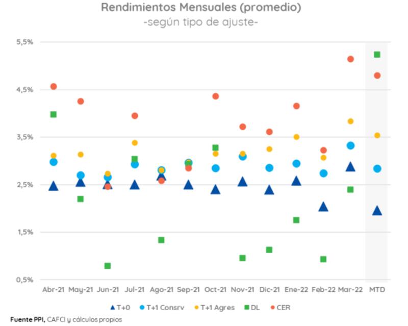 La búsqueda de tasas reales positivas empuja a los inversores a buscar activos que ofrezcan mayor tasa, por lo que favorece a los T+1 y a los CER. En cambio, los money markets (T+0), que son los grandes jugadores de los últimos años, siguen pierdiendo peso.