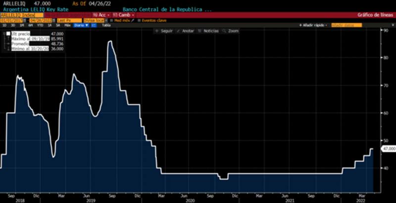 "Mientras que la tasa de la leliq a 28 días ha subido 900bps desde niveles del 38% hasta el 47% de TNA, la tasa de pases a un día lo ha hecho solo en 400bps desde el 32% al 36% de TNA", dijo.