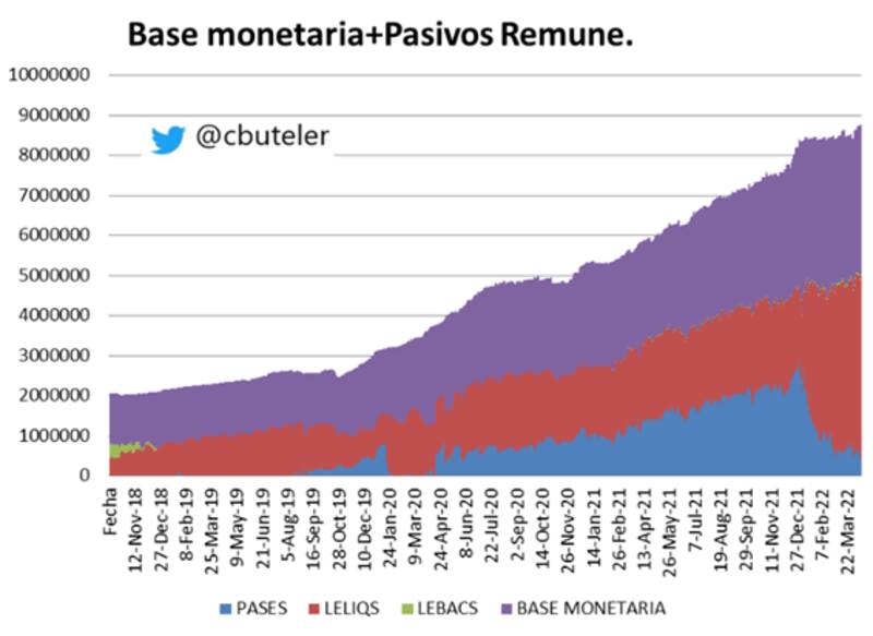 Según datos de Christian Buteler, analista financiero, la base monetaria y los pasivos remunerados suman $ 8,76 billones.