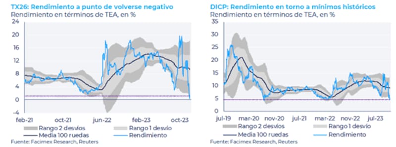 "Frente a esto asumiendo una devaluación real de 30% para los primeros meses del año como pricea la curva de deuda en pesos preferimos posicionarnos en bonos CER con vencimientos que operen a partir de la segunda mitad del 2024. Dado el diferencial de tasas entre el tramo medio y largo de la curva CER para aquellos dispuestos a asumir mayor riesgo duration y teniendo en cuenta la menor liquidez vemos valor en los bonos CER largos como el TX26", dijo Decoud.