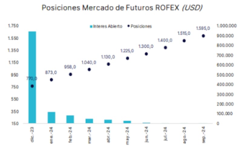 "La posición de diciembre se ubica en $770, implicando una suba directa de 111,8%. Los $ 770 del futuro de diciembre equivalen a $ 708 de hoy traído a valor presente con la tasa de LELIQ. Considerando que el CCL finalizó en $ 950, el mercado de futuros opera con una brecha implícita de 34% para fin de diciembre. Por lo tanto, el consenso de mercado es una fuerte devaluación que no derivaría en una salida del cepo antes de fin de año", dijeron.