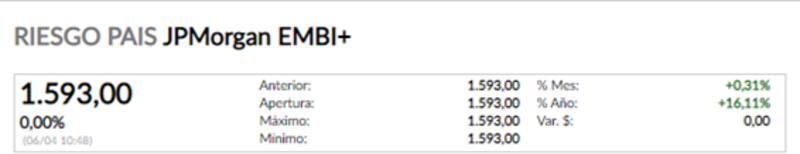 En este escenario, el riesgo país se ubica en 1593 puntos y sube 48% desde el canje de deuda llevado a cabo en septiembre pasado.