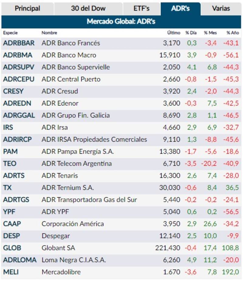 Las acciones argentinas en Nueva York mostraron subas de hasta el 4,9% lideradas por los papeles de Loma Negra. Detrás, con una mejora de 4,1%, se ubicó el Banco Supervielle, mientras que el Banco Macro cerró el podio de mejoras al escalar un 3,9%. En el otro extremo, en tanto, MercadoLibre y Telecom Argentina se destacaron entre aquellas que finalizaron con rendimiento negativo, luego de anotar pérdidas respectivas de 3,6% y 3,5%.