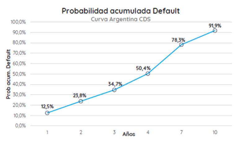 La probabilidad de default a 1 año es del 12,5% y la misma salta al 35% a 3 años, fecha en la que finalizaría el mandato de Fernández. Si se mira al largo plazo, la probabilidad de default a 10 años es del 92%, o prácticamente asegurado.