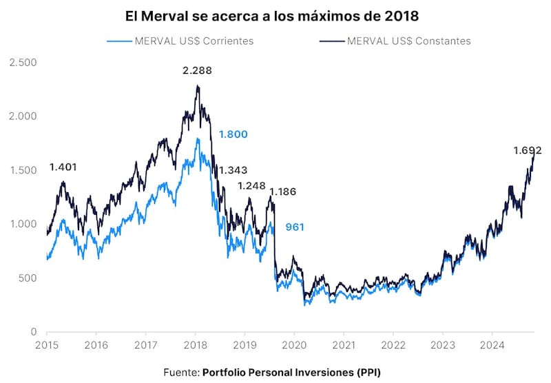 Las acciones argentinas están cada vez más cerca de su máximo histórico nominal. El optimismo del mercado por los progresos macroeconómicos del gobierno de Javier Milei llevó al S&P Merval a tocar los u$s 1760, muy cerca del récord nominal de u$s 1800 que alcanzó a principios de 2018, bajo la gestión del ex presidente Mauricio Macri.