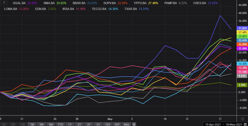 Las acciones del sector financiero acumulan subas de entre el 13% y 19% en el último mes y mas retrasada se ven papeles como Vista (9%), Loma Negra (8%), IRSA (6,6%) y Pampa (2,4%). Las acciones de Edenor muestran una caída en dicho periodo de 2,65%.