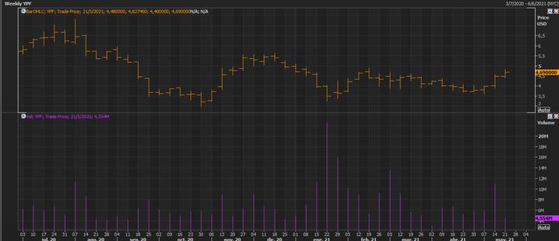 El ADR de YPF alcanzó un volumen negociado la semana pasada de 12 millones de acciones, siendo el nivel mas alto desde abril y así duplicó el volumen negociado de la primera semana de mayo y del volumen promedio semanal de abril.