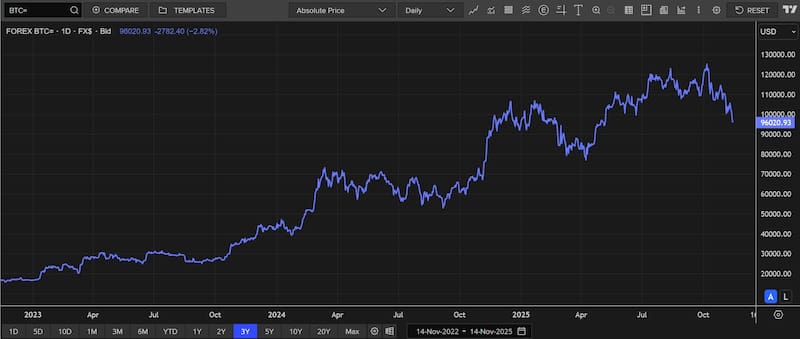 Finalmente, el Bitcoin cae mas del 2,6%, a punto de perforar los u$s 96.000 y operando en los u$s 96.080.