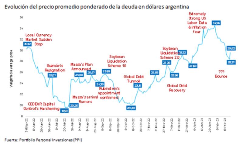 Se observa que los bonos argentinos cayeron mucho más que las acciones, lo cual dejó a la renta variable en un nivel caro en términos relativos a la deuda.