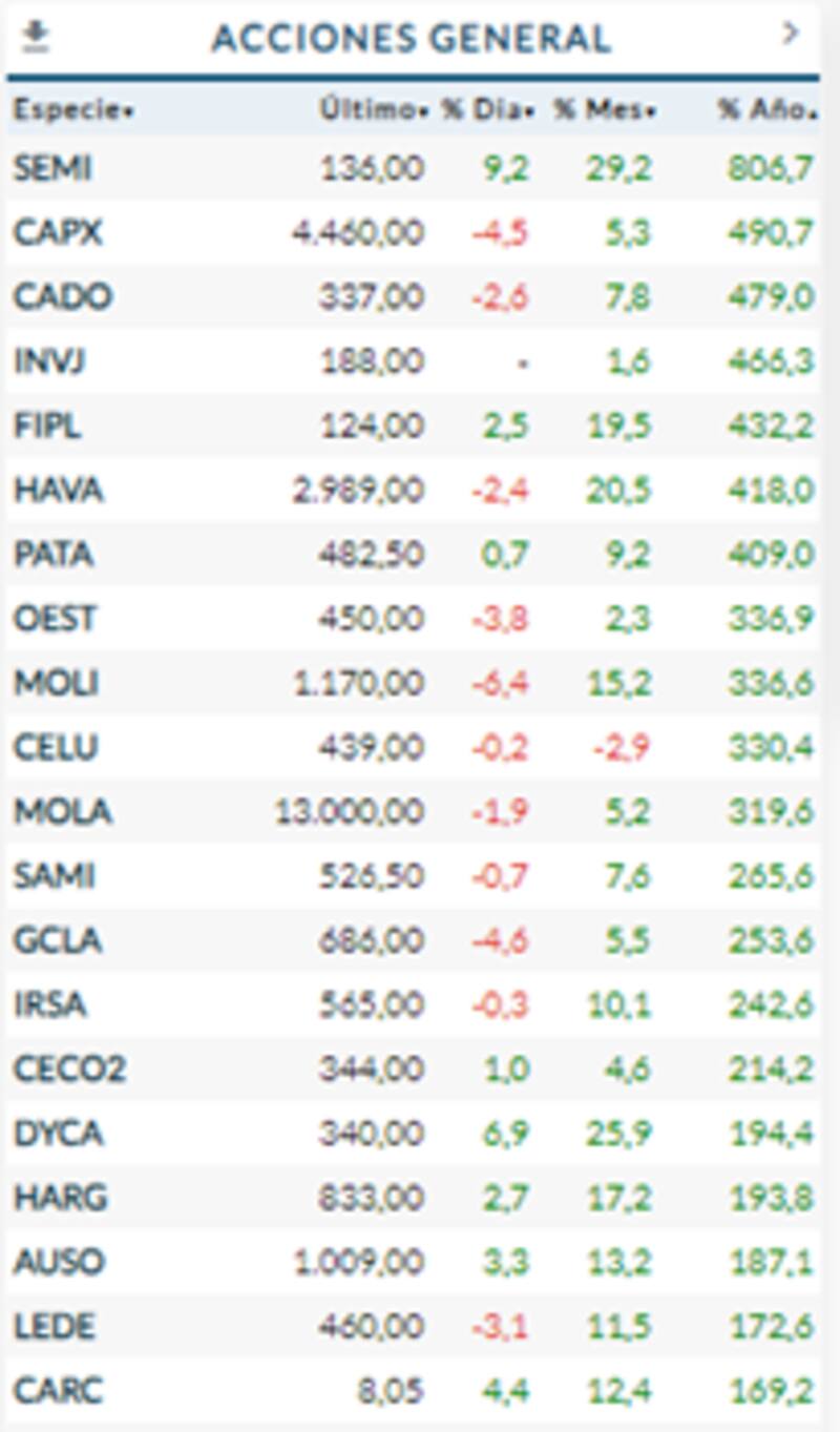 Le sigue Capex, Carlos Casado, Inversora Juramento, Fiplasto, Havana, Banco Patagonia, Autopista del Oeste, Molinos Rio de la Plata, Celulosa, entre otros, con subas de entre 330% y hasta 490% en el año.