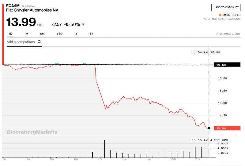 FCA dijo que su ganancia ajustada antes de intereses e impuestos (EBIT) para el período de abril a junio bajó un 11% a 1700 millones de euros (u$s 1990 millones). Analistas consultados por Reuters calculaban un EBIT de 2000 millones de euros.