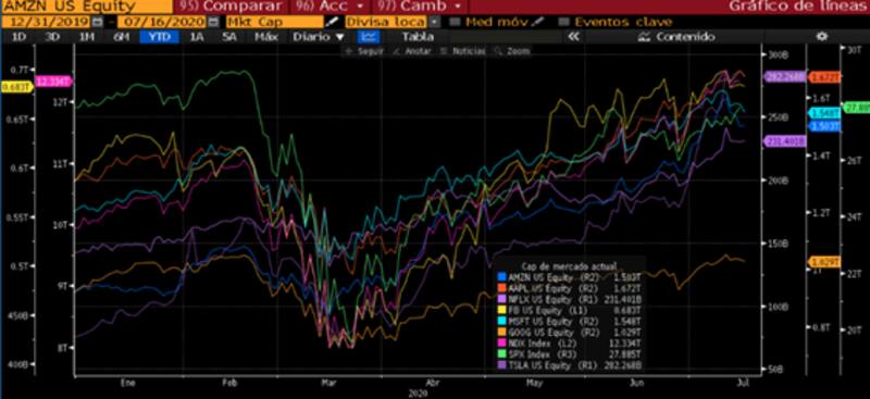 El índice tecnológico nasdaq gana un 22% en el año aunque las compañías líderes como Apple, Amazon, Facebook, Google, Netflix, Microsoft y Tesla registran avances superiores al 22%. Dichas ganancias impacta directamente en su capitalización de mercado y entre todas ellas ganaron 4.5 veces el PBI de Argentina en los primero 7 meses y medio del año. Entre todas sumaron u$s 1.75 trillones en 2020 mientras que el PBI de Argentina es u$s 400.000 millones.