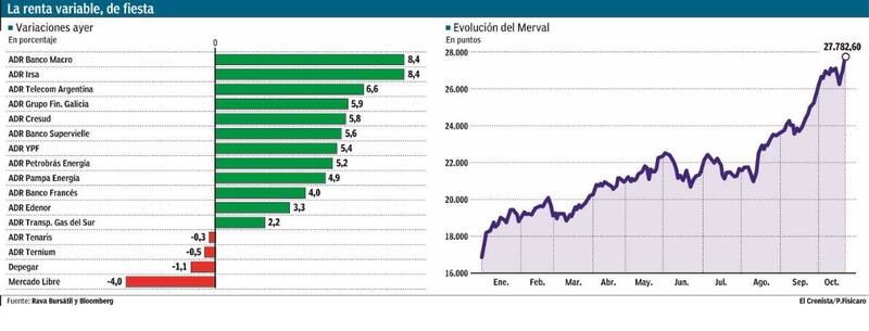 Ya con la victoria de Cambiemos asegurada, los ADRs se dispararon hasta un 8,4%. En cuanto al Merval, el avance fue más moderado, de 3%, aunque convalidado por un volumen de negocios de $ 1.224 millones, el más alto del año. Además, el índice volvió a registrar una marca histórica al terminar en las 27.782 unidades Mientras tanto, los bonos cerraron levemente al alza y el riesgo país cayó a 342 puntos.