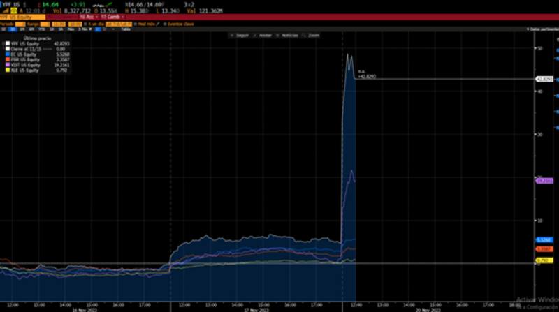 Por ejemplo, las acciones de YPF suben 42% en el día de hoy, junto con Vista que gana 19%. En cambio, sus comparables de la región, como Ecopetrol y Petrobras apenas suman 5,5% y 3,5% respectivamente.