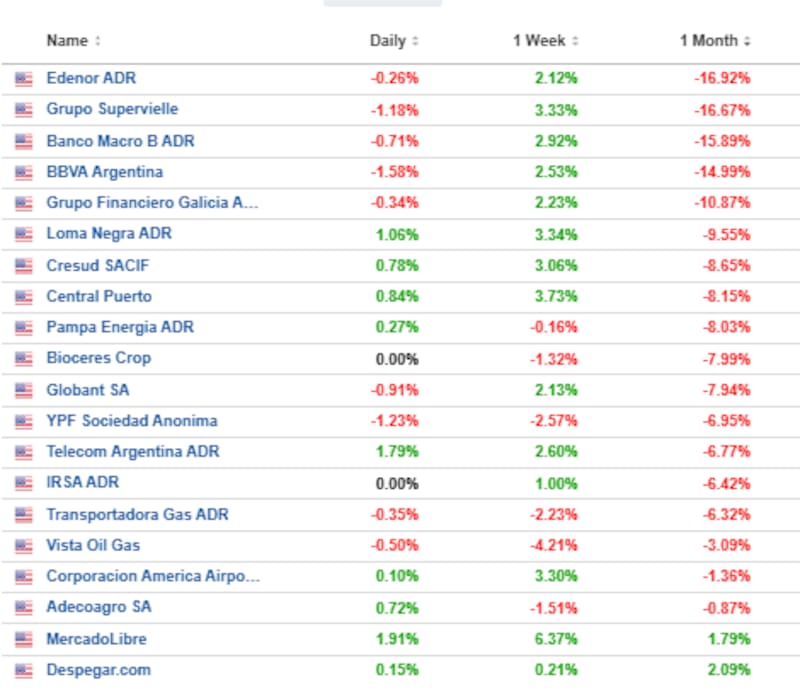Las mayores pérdidas en el último mes se dan en Edenor que caen 17%, junto con Grupo Supervielle, Banco Macro, BBVA Argentina y Grupo Financiero Galicia, con caídas de 11% a 17%.