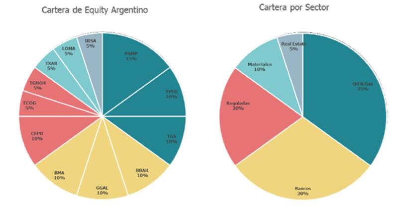 En cuanto a nombres propios, la exposición se distribuye en un 15% en Pampa, 10% en YPF y 10% en TGS. Le siguen 10% en Central Puerto, 5% en Ecogas y 5% en TGNO. En el sector bancario recomiendan un 10% en Galicia y 10% en BBVA Argentina y 10% en Banco Macro, mientras que la cartera se completa con un 5% en Ternium, 5% en Loma negra y 5% en IRSA.