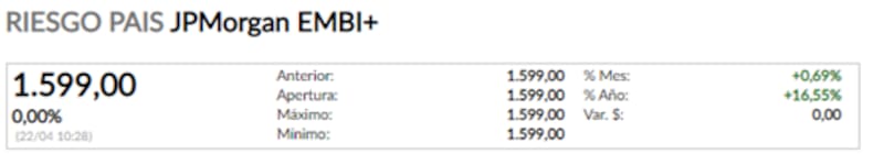 Acompañando la debilidad de los bonos, el riesgo país argentino se mantiene hoy en 1599 puntos, avanzando 47% desde el piso de septiembre pasado, fecha en la que el Gobierno oficializó el canje de deuda con acreedores internacionales por u$s 65.000 millones.