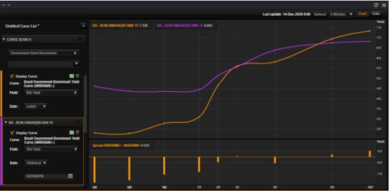 La curva soberana brasilera tuvo una dinámica positiva a lo largo del año. La misma se desplazó hacia abajo y mantuvo la pendiente positiva en los tramos cortos y largos de la misma, lo cual se dio gracias a las subas de los bonos soberanos a lo largo del año.