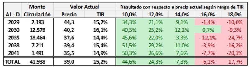 En tanto, si llegaran a 12% (compatible con niveles de riesgo país todavía superiores a 1100 puntos), la ganancia de capital ya sería en promedio para toda la familia de bonos del 24,3%, estimó el economista jefe de Quinquela.