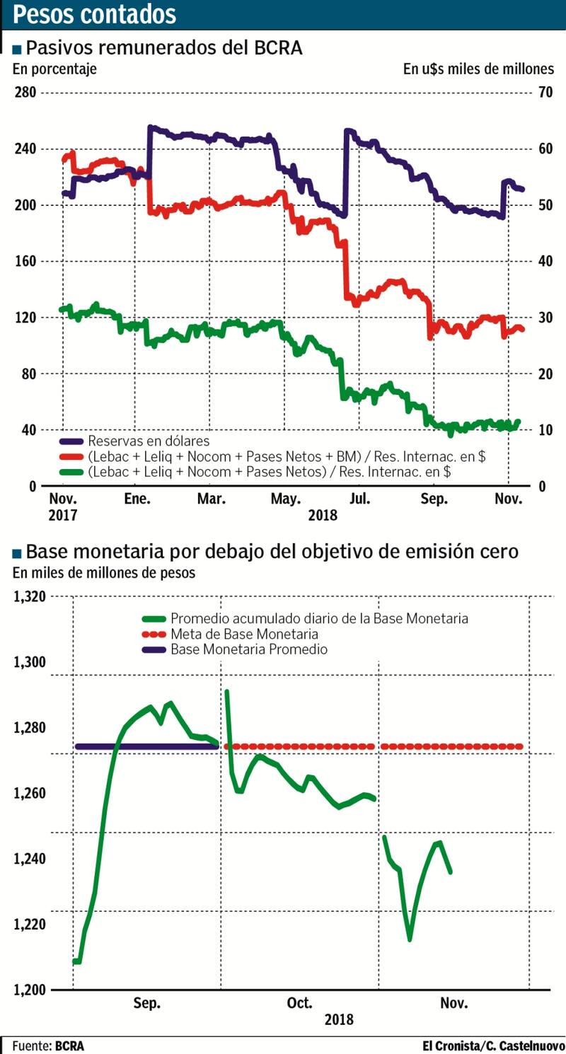 La inyección de al menos $ 120.000 millones que tendrá lugar mañana, cuando se liquide lo que se licite hoy, no tendrá mayor impacto para el objetivo oficial de mantener en cero la emisión monetaria hasta junio del año que viene. La entidad conducida por Guido Sandleris informó el viernes pasado que en las primeras tres quincenas del nuevo régimen monetario sobrecumplió su objetivo de que la base monetaria no crezca un peso. El nivel promedio de base monetaria está 3% por debajo del promedio de septiembre, punto de partida para el plan.