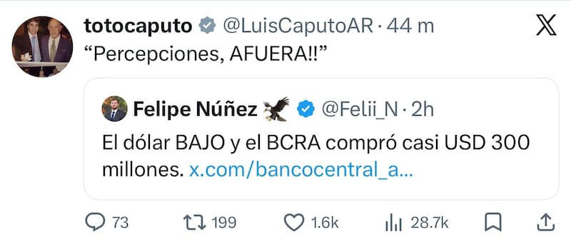 “Percepciones, AFUERA”, publicó Caputo en respuesta al posteo de un usuario que hablaba sobre la baja del dólar y la compra de reservas por parte del BCRA.