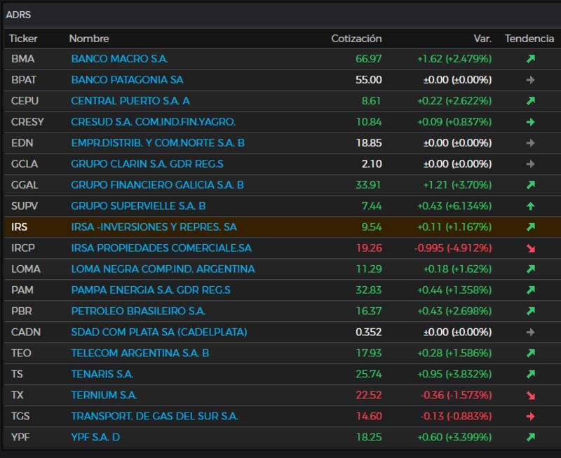 Los ADRs (american depositary receipts, como se conoce en Nueva York a los papeles de empresas extranjeras) presentan mayoría de saldos positivos, incluso algunos muy notables como es el caso del Banco Supervielle, que trepó 6,13%. Lo siguen los papeles de Tenaris y Grupo Financiero Galicia, que ganan 3,79% y 3,7%, respectivamente, más los de YPF, que sumaron 3,4%.