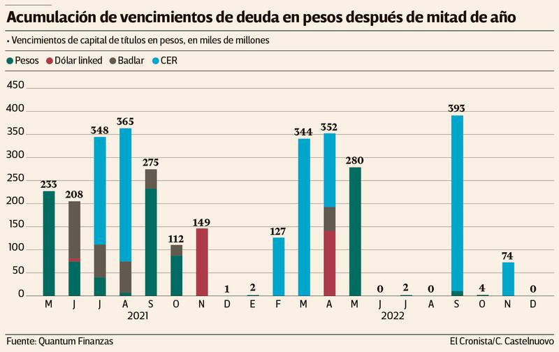De cara a lo que viene, Quantum cree que al Gobierno aún le falta atravesar un período particularmente desafiante en materia de deuda en pesos y es aquel que va del séptimo al noveno mes de este año.