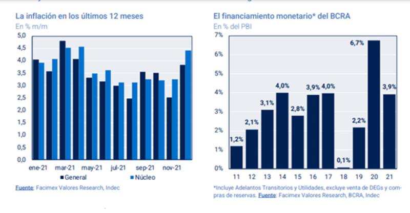 Por otro lado, en cuanto al sendero monetario, apuntan a reducir el financiamiento monetario de 3,7% del PBI en 2021 a 1% en 2022.