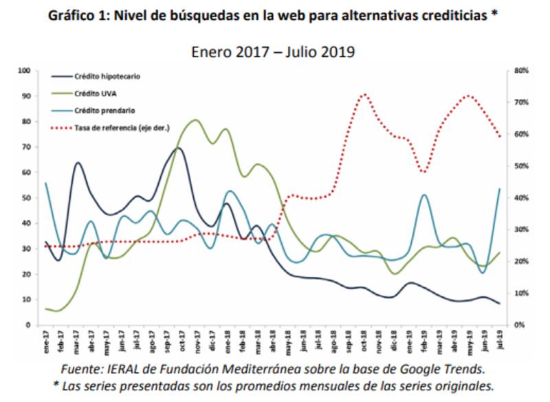 "En relación a los créditos hipotecarios y UVA, sus picos máximos de interés se observan alrededor de octubre de 2017, donde paralelamente la tasa de política monetaria rondaba el 26% nominal anual. Tomando el último dato de la segunda semana de julio, la tasa de interés aumentó 32 puntos porcentuales desde la fecha citada, mientras que el interés en la web por los créditos hipotecarios registra una baja del 88%; para los préstamos UVA, esta caída ronda 69%", dice el estudio distribuido por Fundación Mediterránea/IERAL.