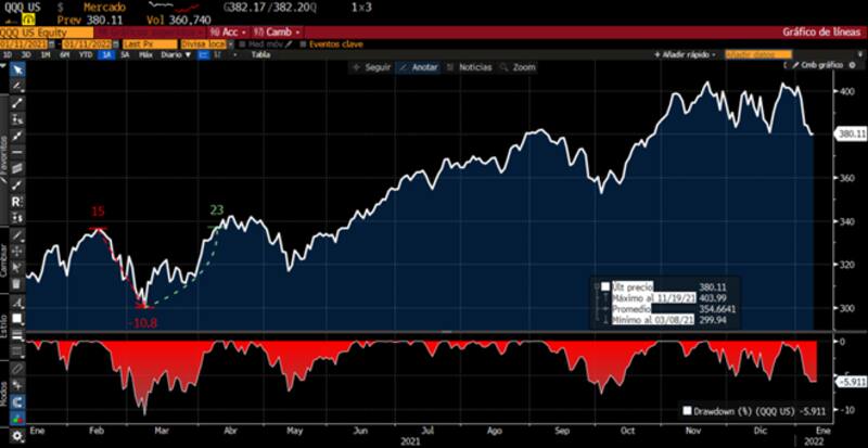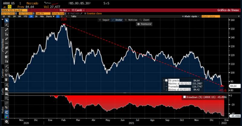 Si se toma el índice ARK Innovation (ARKK) que agrupa las acciones del sector tecnológico y de valor, con potencial de crecimiento futuro, se observa que éstas acumulan pérdidas en promedio del 45% desde sus máximos históricos, lo cual refuerza el contexto adverso que enfrenta el sector.