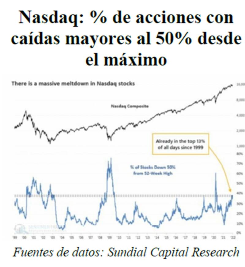 Según datos elaborados por Sundial Capital Research, el 40% de las acciones dentro del Nasdaq ya acumulan caídas de mas del 50% desde sus máximos históricos hasta los valores actuales.
