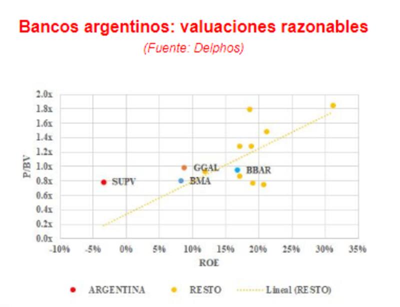 Yendo al agregado, para los especialistas de Delphos Investment, los bancos argentinos en general se mantienen a valuaciones bajas relativas al resto del sector financiero de la región.