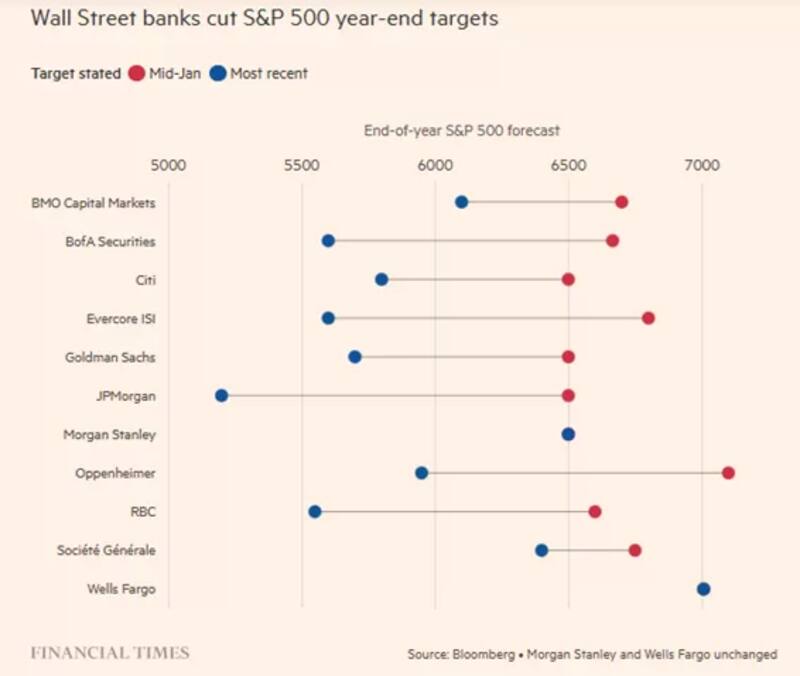 Casos como Citi, Goldman Sachs y JP Morgan esperaban que el S&P500 cierre este año en 6500 puntos, pero ahora el Citi espera que lo haga en 5800 puntos, Goldman proyecta un cierre en 5600 puntos y JP Morgan, 5200 puntos.
