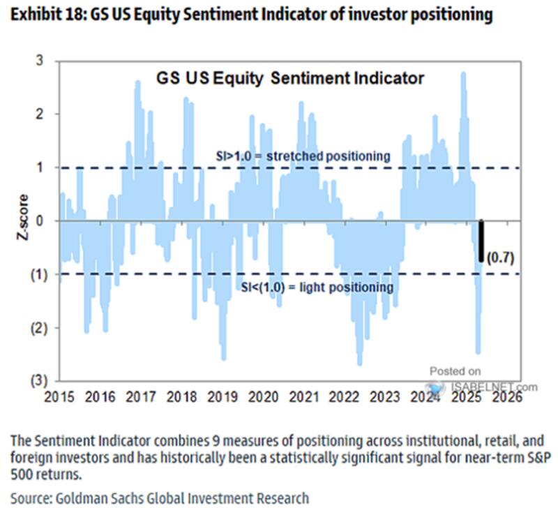 En la misma línea, el indicador de sentimiento bursátil estadounidense de Goldman Sachs se sitúa actualmente en -0,7, lo que sugiere pocos cambios en los rendimientos del S&P 500 esperados para el próximo mes.