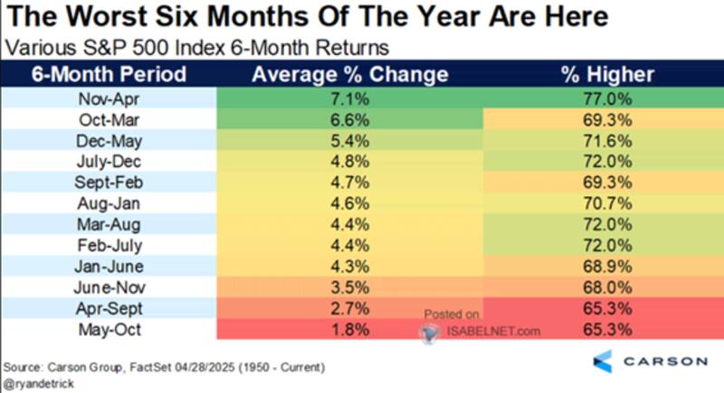 Según la consultora internacional Carson, el S&P500 suele subir 1,8% en el semestre que va de mayo a finales de octubre, siendo el peor retorno semestral del año.