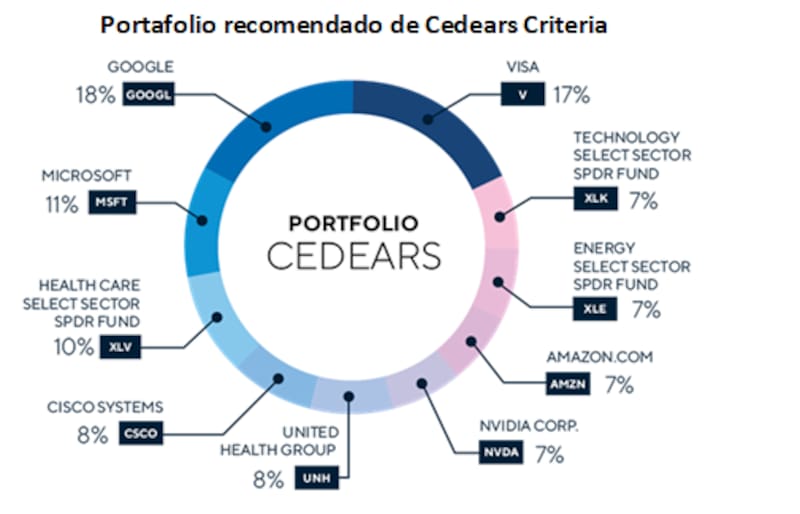 El portafolio recomendado de Criteria consta de un 17% en Vista, 18% en Google, 11% en Microsoft, 8% en Cisco, 8% en United Health Group, 7% en Nvidia y 7% en Amazon. El resto del portafolio se compone por ETF del sector tecnológico (7%), 7% en el ETF del sector de energía y 10% en el de salud.