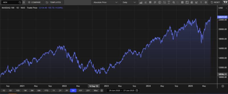 Recientemente las acciones Wall Street alcanzaron nuevos máximos históricos. En Nasdaq sube 7,4% en el año y opera en máximos. El S&P500 sube 5,1%, mientras que el Dow Jones sube en 2025 un 3,2%.
