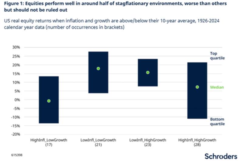 Según sus estimaciones, las acciones suelen tener dificultades durante los años de estanflación en comparación con otros entornos.