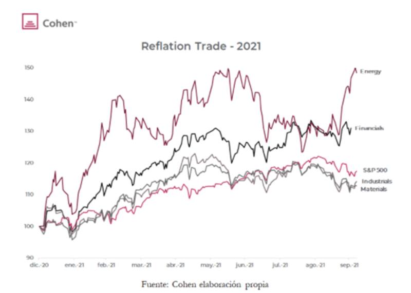 El Reflation Trade -inflación en activos financieros- registró un renacer en los últimos 15 días. Las energéticas y el sector financiero subieron 15% y 5,8% -respectivamente, diferenciándose del S&P 500, que se mantuvo neutral y acumula una baja de 3,8% desde los máximos.
