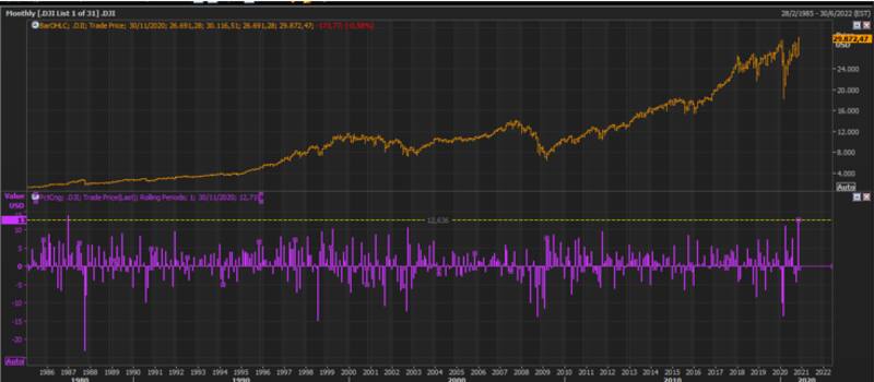 Noviembre no fue un mes más en la historia del Dow Jones. El índice ganó 12,7% y de esta manera alcanza la mayor avance mensual desde 1987 cuando en enero de aquel año supo avanzar 13,8%.