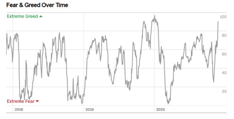 Ahora bien, el rally reciente en las acciones americanas coloca a Wall Street en el nivel de optimismo más alto en lo que va del año, lo cual puede ser un llamado de atención. El índice Fear and Greed Index que mide CNN muestra que el nivel de optimismo (o sentimiento alcista) en Wall Street es del 91%.