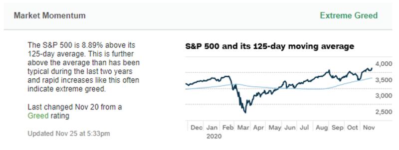 Finalmente, otro de los datos históricos es la distancia que existe entre los precios y su media móvil. El índice elaborado por CNN toma la media de 125 días y el valor actual de los precios y calcula su distancia, la cual arroja que actualmente dicha diferencia es de 8,9% y es el nivel más alto de lo que ha venido operando en promedio el mercado en los últimos 2 años.