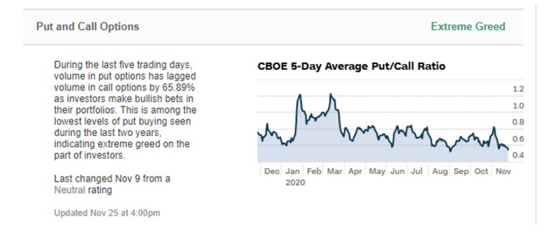 Si el ratio es muy bajo implica que hay muy pocos inversores apostando a la baja por cada inversor apostando al alza. Ese ratio alcanza actualmente el nivel más bajo en dos años, indicando un nivel de optimismo elevado.