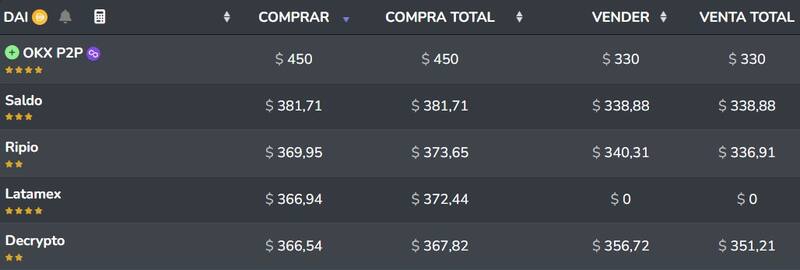 En el sitio Criptoya, que revela la cotización de diferentes monedas estables, se puede observar que DAI llega a comercializarse por $ 450 en el exchange OKX P2P. Cabe mencionar que este activo busca mantener su valor lo más cercano posible al dólar estadounidense.