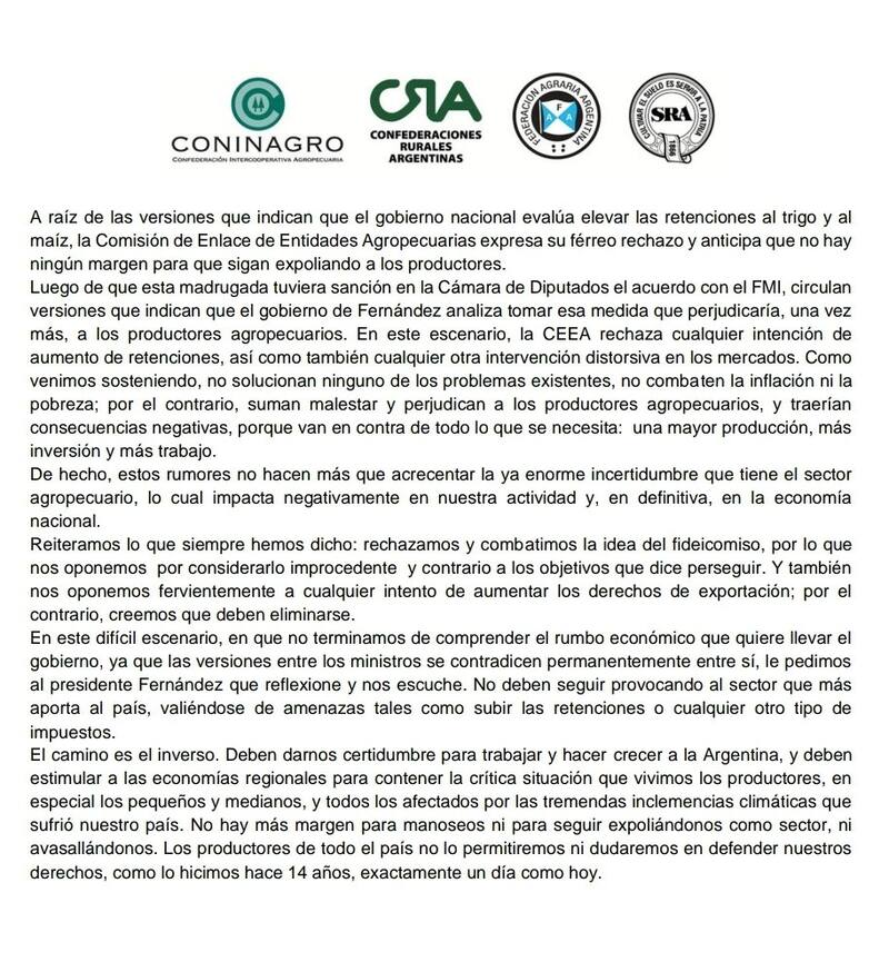 Con el rechazo ya anticipado por los integrantes de la Comisión de Enlace de Entidades Agropecuarias quienes aseguraron que "no hay margen para que sigan expoliando a los productores", según se advierte en un comunicado, la medida podría dejar consigo un "golpe en los ingresos de dólares" y "problemas para el Banco Central".